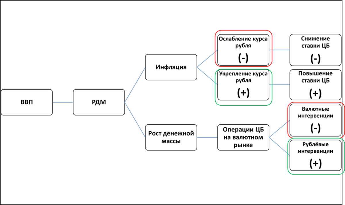 Денежная масса при этом уменьшается, что было одной из главных причин кризисов в 2008 и 2015 годах.
