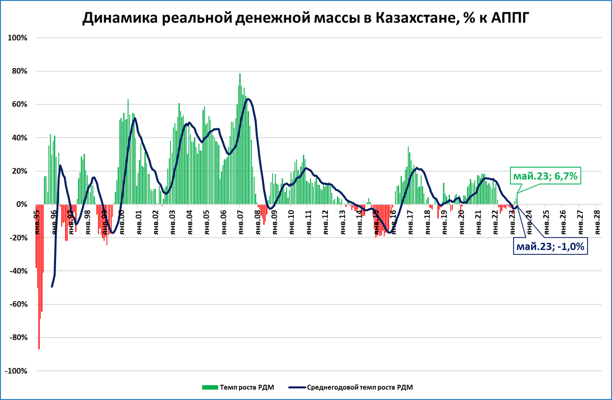 С учётом инфляции реальная денежная масса (РДМ) в мае сократилась на 5,1% годовых.
