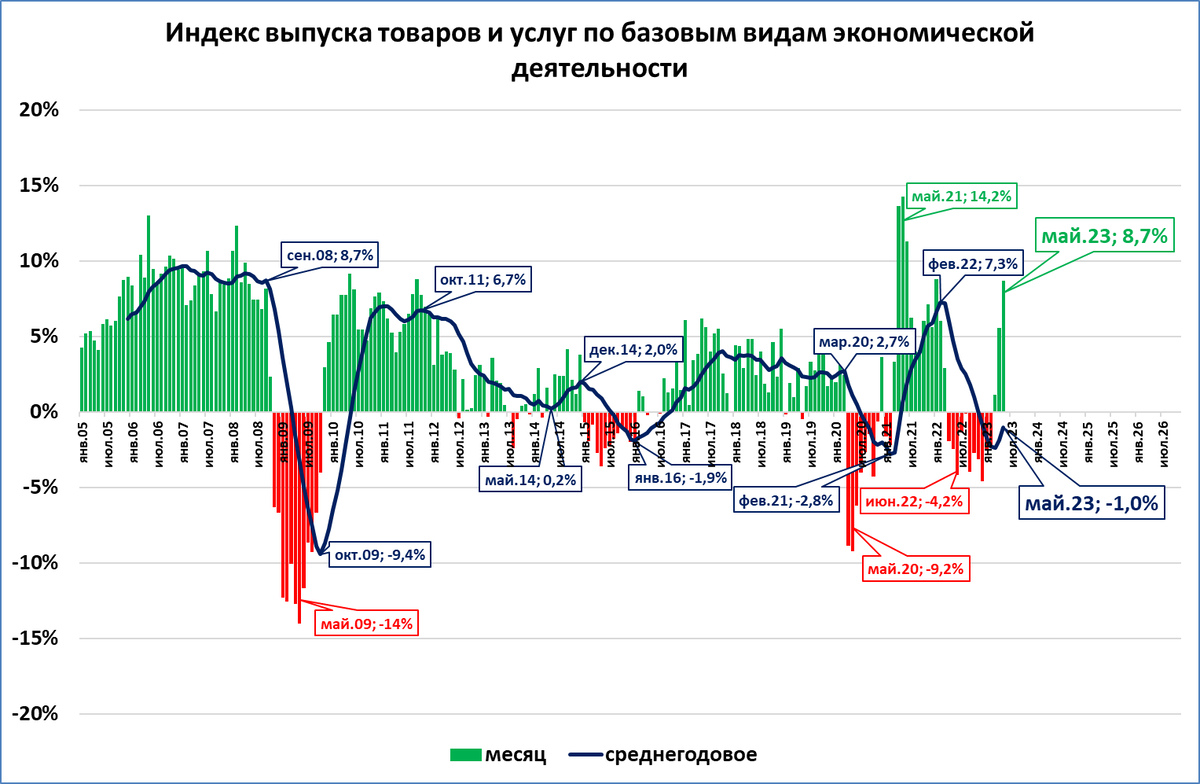 Выпуск товаров и услуг в мае этого года превзошёл все предыдущие майские максимумы (2021 и 2018 годов).
