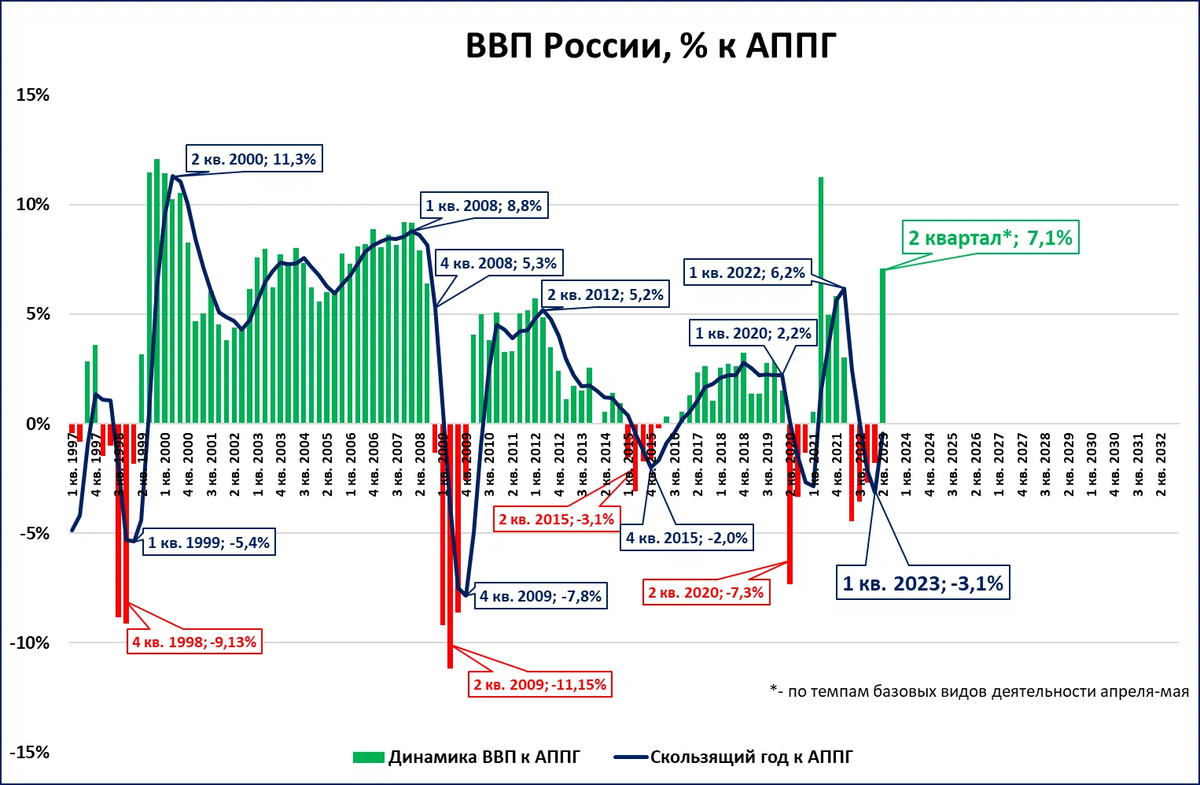 В первые два месяца второго квартала (в апреле и мае) базовые виды деятельности показали рост +7,1% годовых. Это говорит о быстром росте ВВП во 2 квартале. Предположим: