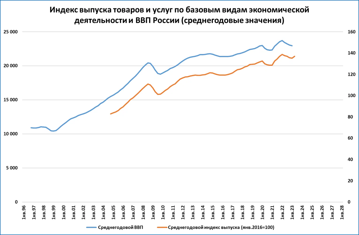 Если промпроизводство — это порядка 30% ВВП, то выпуск по базовым видам деятельности — это уже порядка 60% ВВП. Кроме промпроизводства к базовым видам деятельности относятся сельское хозяйство, строительство, транспорт и торговля (оптовая и розничная).