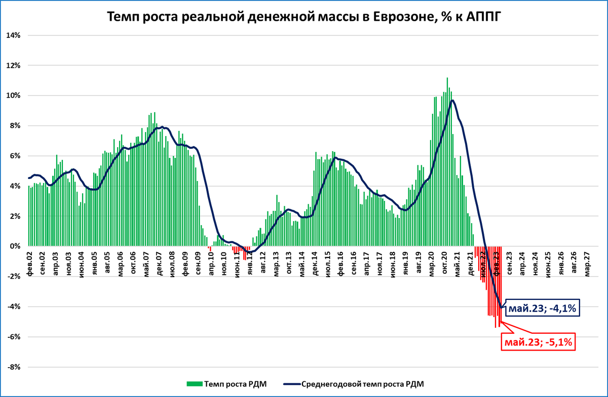 ● В Еврозоне реальная денежная масса в мае продолжала сжиматься: -5,1%.