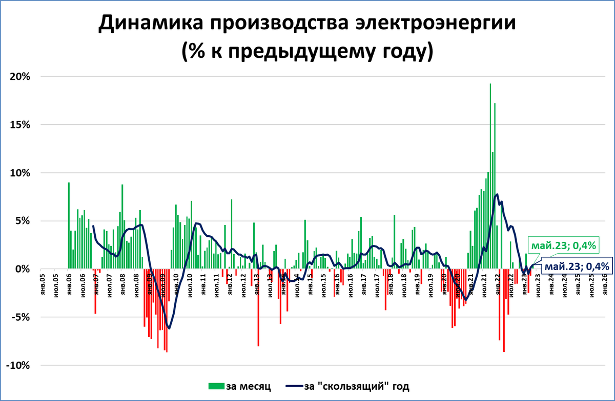 В мае производство электроэнергии выросло на символические 0,4% к маю прошлого года.