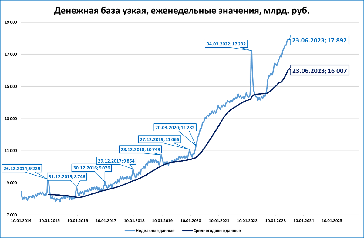Узкая денежная база за неделю почти не изменилась, так же 17,9 трлн рублей.