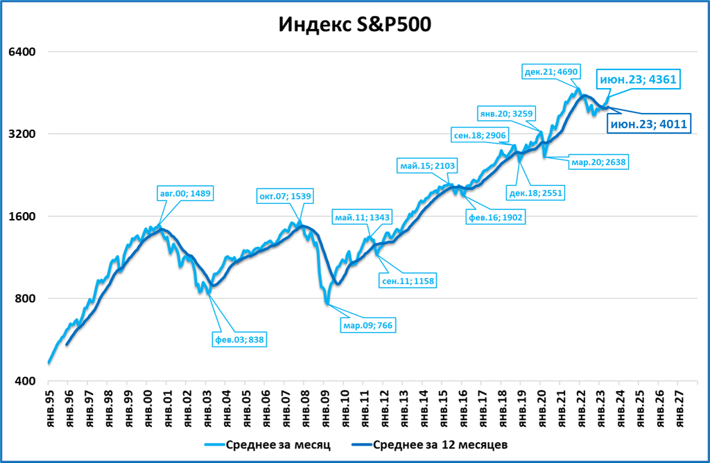 В июне среднемесячное значение индекса S&P500 поднялось выше среднегодового и составило 4361 пункт.