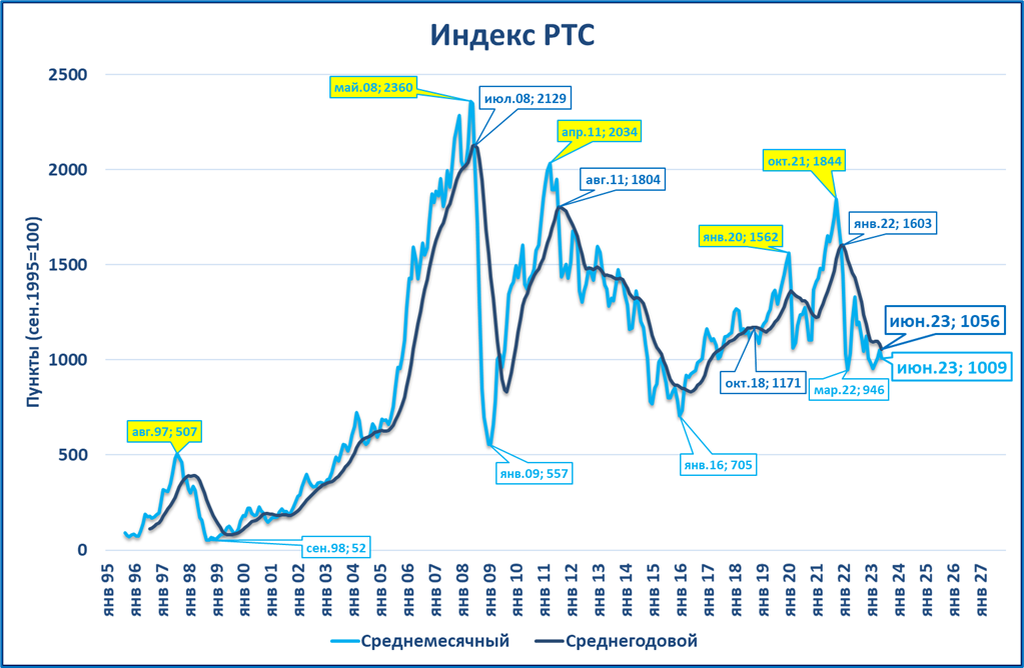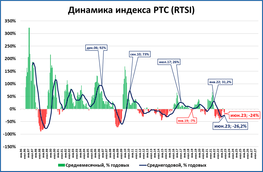 ● Индекс РТС (-24% годовых) снижается 17 месяцев подряд.