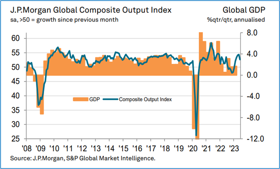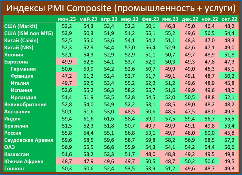 В июне ситуация сохранилась: композитный индекс деловой активности в мире (глобальный) остаётся выше 50 пунктов (= деловая активность растёт), хотя и немного снижается.