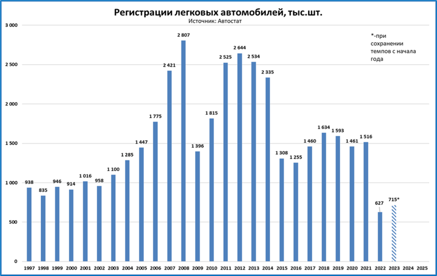 Рост с начала года (за первые 6 месяцев) составил +14% к первому полугодию прошлого года. Сделаем самый скромный прогноз: если темпы первого полугодия сохранятся до конца года, то рынок в 2023 году вырастет до 715 тысяч.