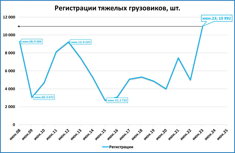 В июне, по нашей предварительной оценке, в органах ГИБДД России было зарегистрировано 11 тысяч новых тяжёлых грузовиков.