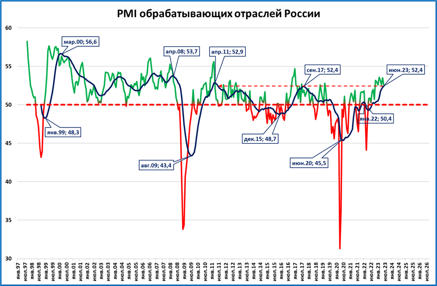 ● Выше 53 пунктов в 2021 году индекс продержался 4 месяца. В 2023 году он держится выше 53 пунктов уже пять месяцев.