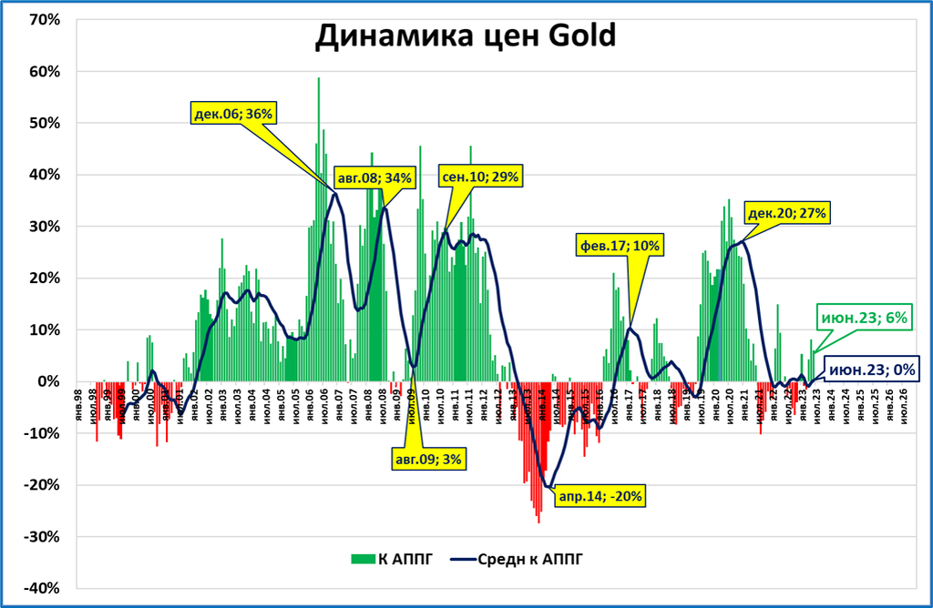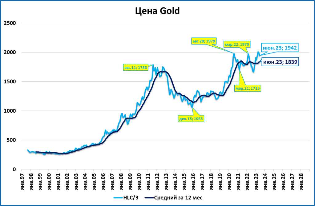 Цена на золото растёт третий месяц подряд. При этом среднегодовые цены (тёмно-синяя линия на первом графике) остаются стабильными уже более двух лет.