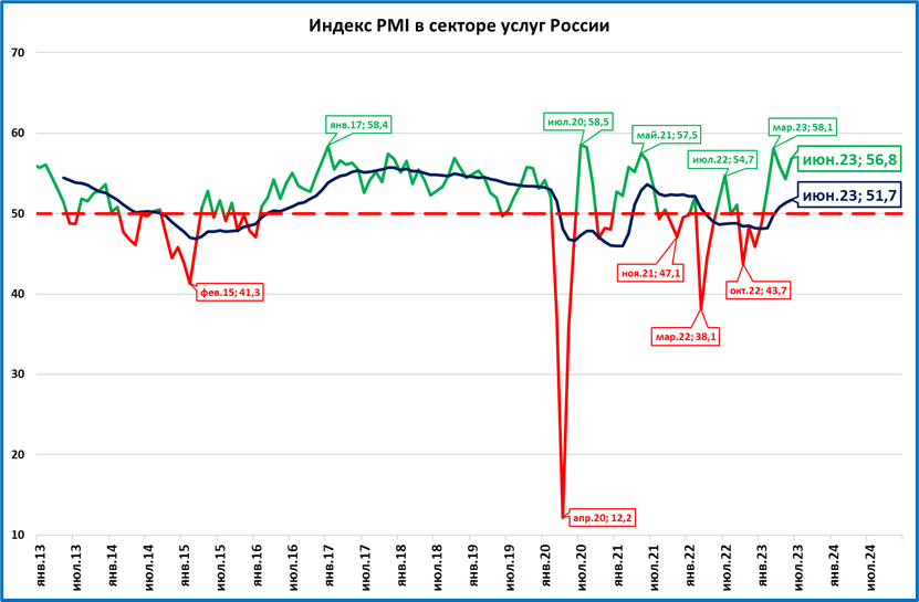 Достигнутый на сегодняшний день пик 2023 года (56,8) выше, чем пик 2021 года (56,2).