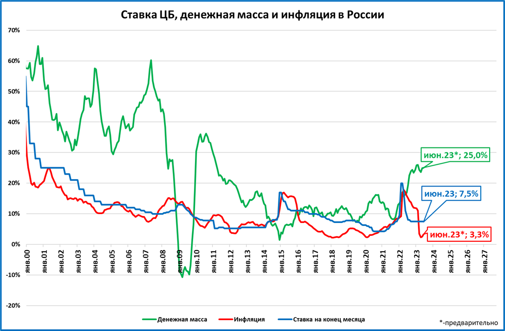 ЦБ опубликовал оценку денежной массы по итогам июня (на 1.07.2023). Она выросла на 25% годовых (+24,9% месяцем ранее).