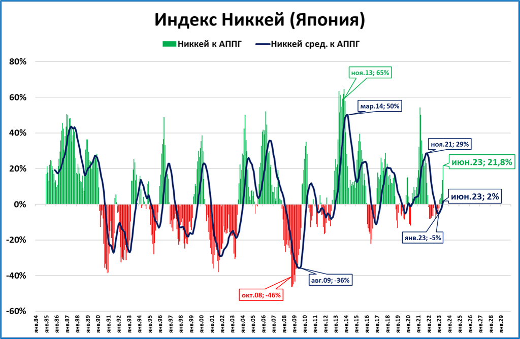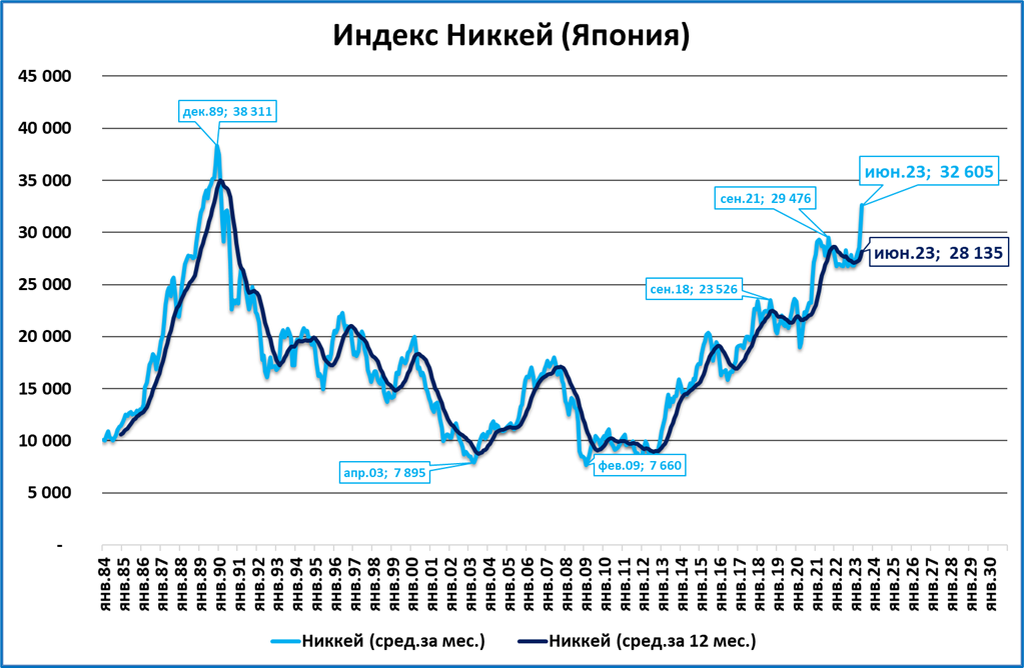 В июне среднемесячное значение японского индекса Никкей составило 32 605 пунктов.