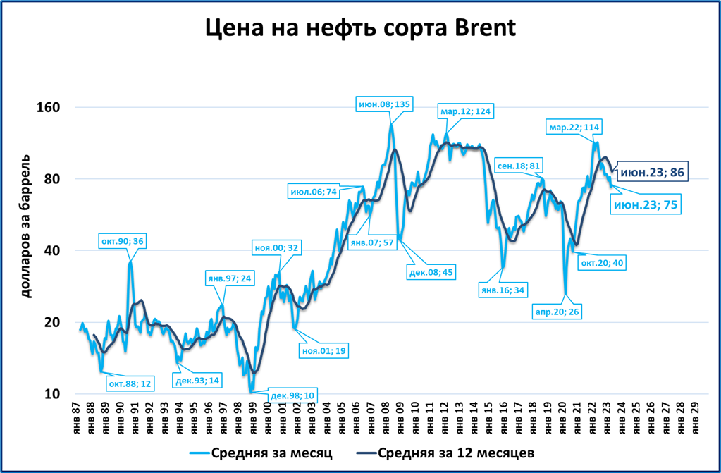 В июне среднемесячные цены на нефть сорта Брент составляли 75 долларов за баррель.