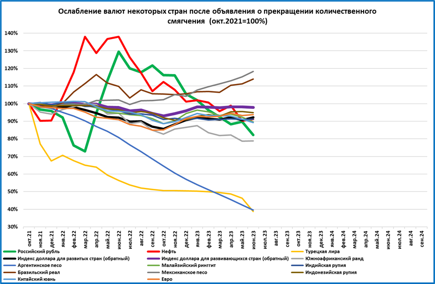 ● Рубль в июне из группы «середнячков» (падение к доллару США не более 10% с октября 2021 года) переместился в аутсайдеры (падение более 10%), составив компанию валютам Турции, Аргентины и ЮАР.