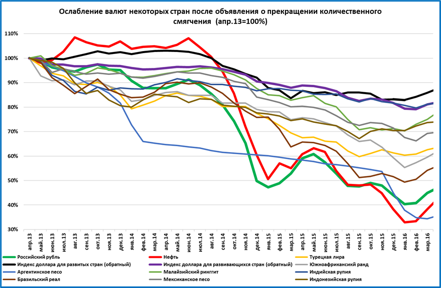 Когда ФРС весной 2013 года объявила о предстоящем в 2014 году сворачивании количественного смягчения, валюты развивающихся стран отреагировали на это снижением.