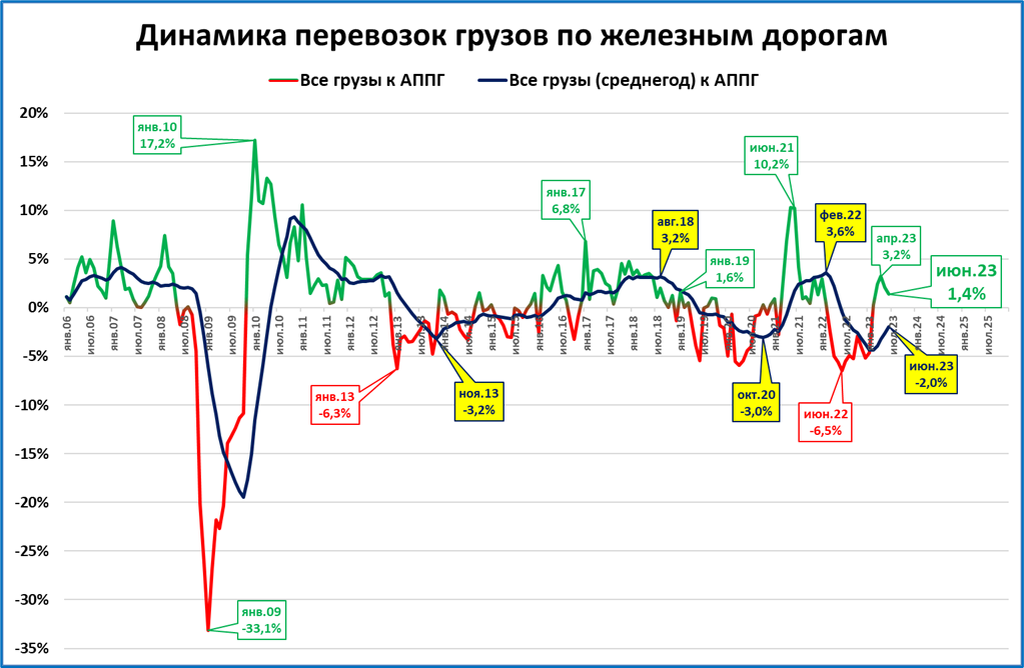 ● Перевозки грузов по железнодорожным в июне выросли на 1,4%. И это несмотря на падение перевозок по отдельным категориям грузов, таким как цемент (-1,3% годовых).