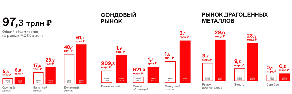 А общий объем торгов на рынках Московской биржи в июне 2023 года превысил 97 трлн, - это на треть выше, чем в аналогичный период прошлого года. В июне все рынки продемонстрировали положительную динамику.