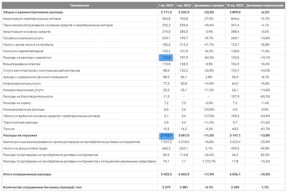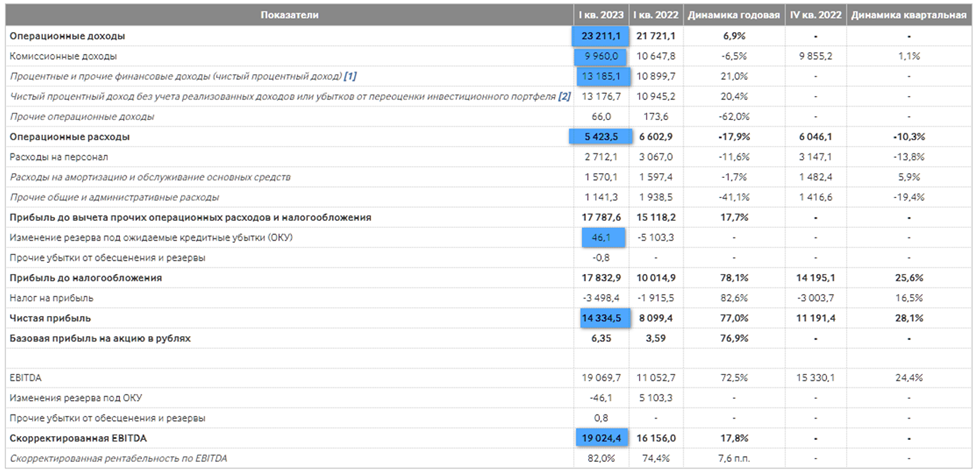 Ожидалось сокращение процентных доходов, но как видим из отчета, они выросли на 20% г/г. Мосбиржа сообщила, что не все клиенты могут открыть счета в АСВ, поэтому часть денег всё-таки остается на балансе. И судя по всему, компания продолжит получать какую-то часть процентных сверхдоходов. Но все-таки, вероятно, они должны снизиться. Результаты 2Q23 будут более показательны в этой части.