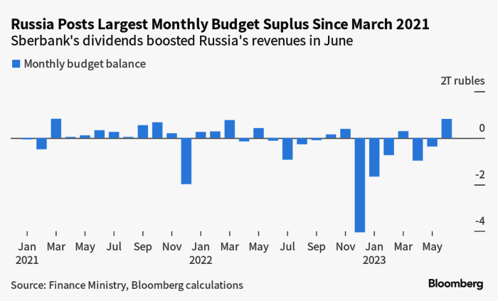 Профицит российского бюджета стал самым высоким с марта 2021 года, но снова оказался в плюсе в основном благодаря огромным дивидендам крупнейшего государственного банка.