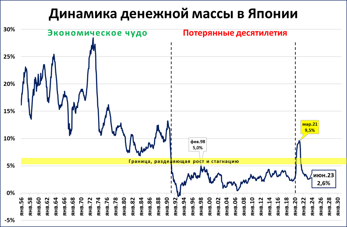 Инфляция в Японии традиционно низка, поэтому даже график номинальной денежной массы хорошо иллюстрирует динамику экономики.