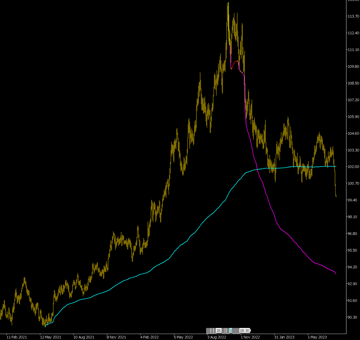 А что мы видим сейчас? За последние 6 дней индекс потерял под 3%. Довольно резкое движение для данного инструмента. Более того, индекс уверенно пробил VWAP, построенный от старта сильного восходящего движения 21-22 годов. Он в этом году дважды пытался пробить VWAP, но это было неуверенно, с последующим отскоками, которые, правда, становились всё слабее. Если ситуация будет развиваться, то индекс могут уронить на целевую (пурпурная кривая).
