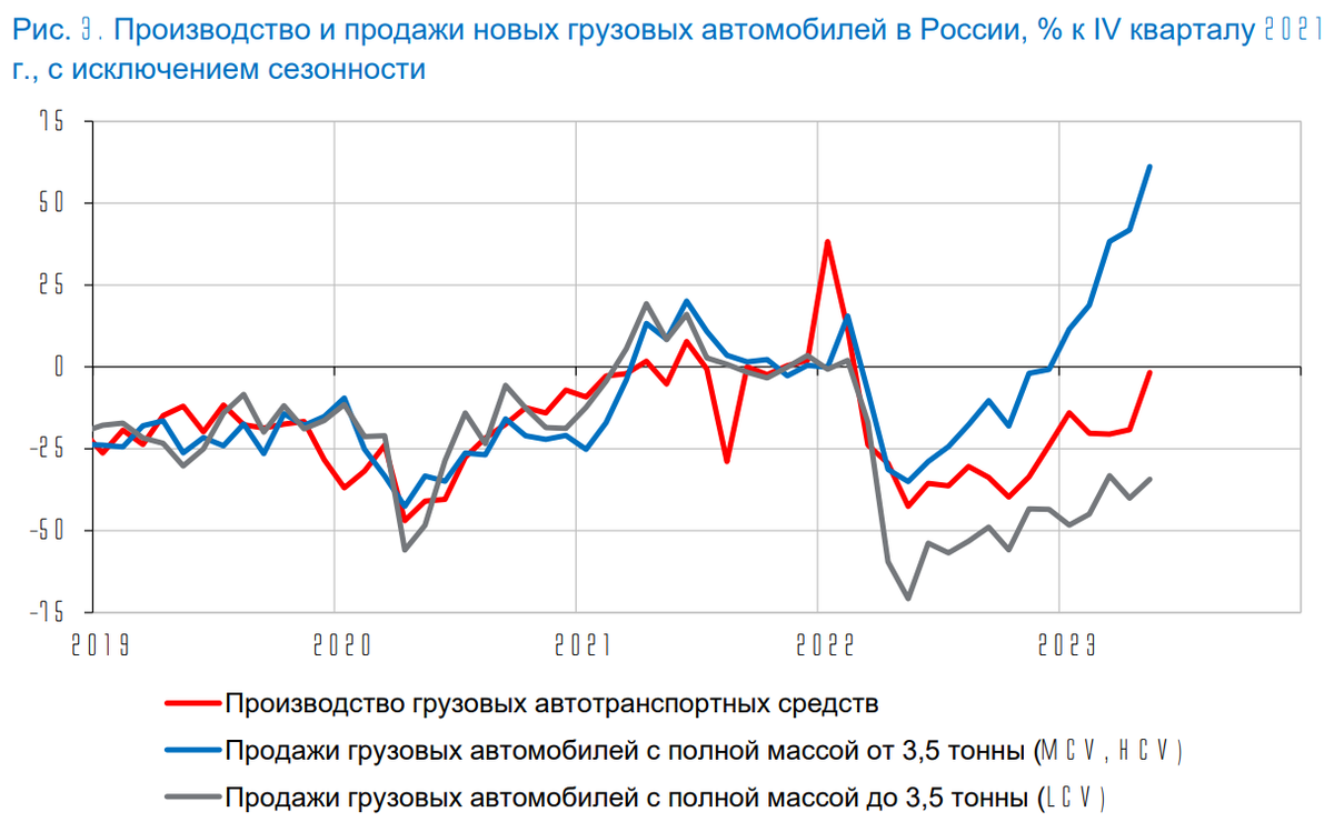 По данным Росстата, производство грузовых автотранспортных средств в России по итогам 2022 г. снизилось на 24% в результате прекращения сборки грузовиков некоторых иностранных брендов (в 2021 г. на них приходилось около четверти совокупного выпуска грузовых автомобилей). При этом производство отечественных брендов сократилось приблизительно лишь на 10%. Восстановление выпуска грузовиков отечественных брендов в России ускорилось к концу2022 г., а ближе к середине 2023 г. практически вернулось к докризисному уровню.