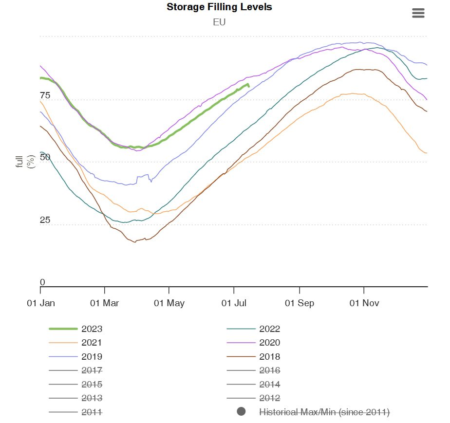 Европейские газовые хранилища заполнены на 80,07%. По состоянию на 15 июля. Интересно, что 14 июля цифры была другая - 81,05%. За день всхуднули практически на 1%.