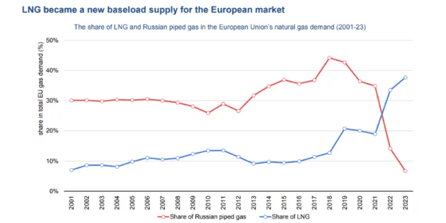 СПГ стал основным источником поставок для Европы, при этом его доля в общем спросе ЕС выросла в среднем с 12% в 2010х гг. до почти 35% в 2022 г., что сопоставимо с долей российского трубопроводного газа в период до конфликта на Украине,
