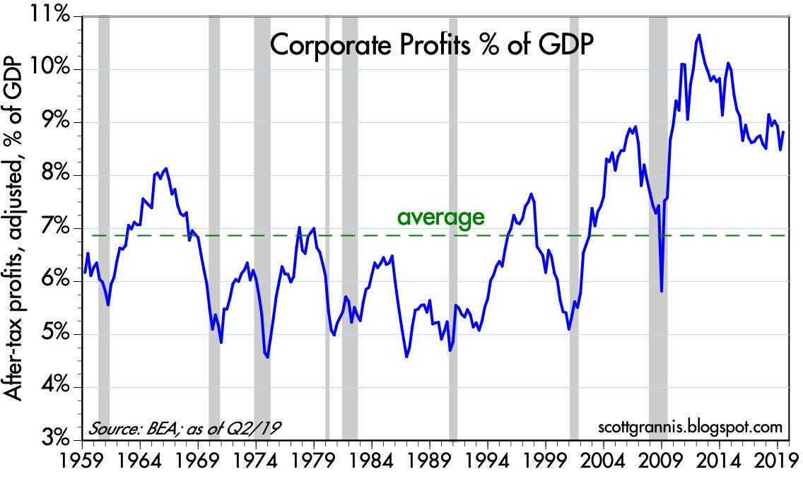 Но это объяснение страдает от недостатка конкретики: вряд ли возможно точно и достоверно измерить степень оптимизма в интересующий нас момент времени. Поэтому мы можем зайти с другой стороны. Одной из ключевых характеристик экономических циклов являются колебания уровня корпоративных прибылей: