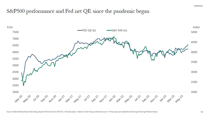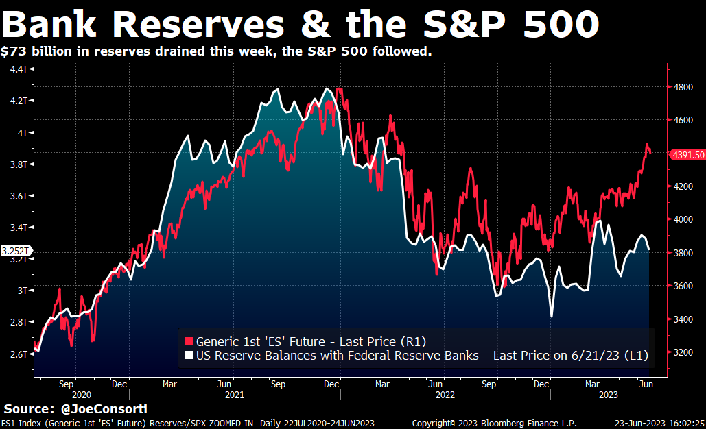 Навскидку, могла ли быть особенно тесной связь акций и политики ФРС в период с июля 2020 по март 2023? Как минимум, финансовый сектор испытал исторически беспрецедентный скачок банковских резервов, беспрецедентное расширение баланса ФРС. Пресловутую «базуку» имени Марио Драги. Логично ожидать, что после окончания этого «девятого вала» ликвидности рынки почувствовали болезненный абстинентный синдром.