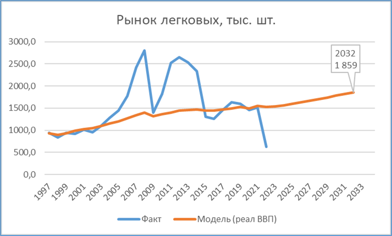 Можно предполагать, что фактический рынок может оказаться как ниже значений по модели (например, в 2023 году восстановится примерно до 1млн.), так и выше, как это бывало в прошлом.