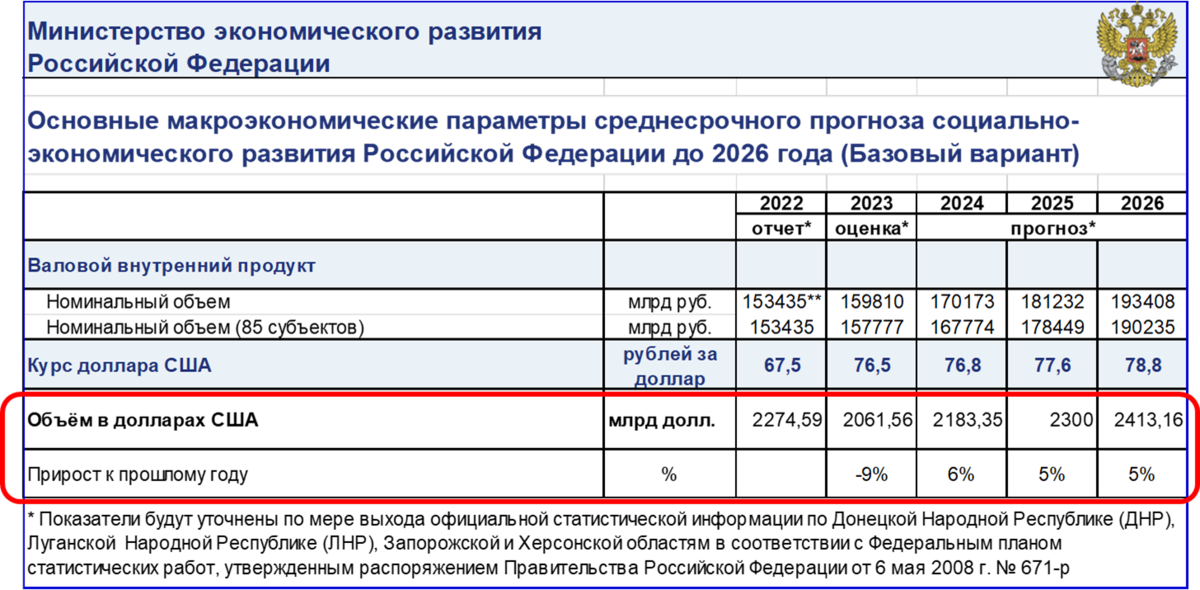 Две нижние строки таблицы (объём ВВП в долларах США и прирост к прошлому году; обведены красным) рассчитаны нами.