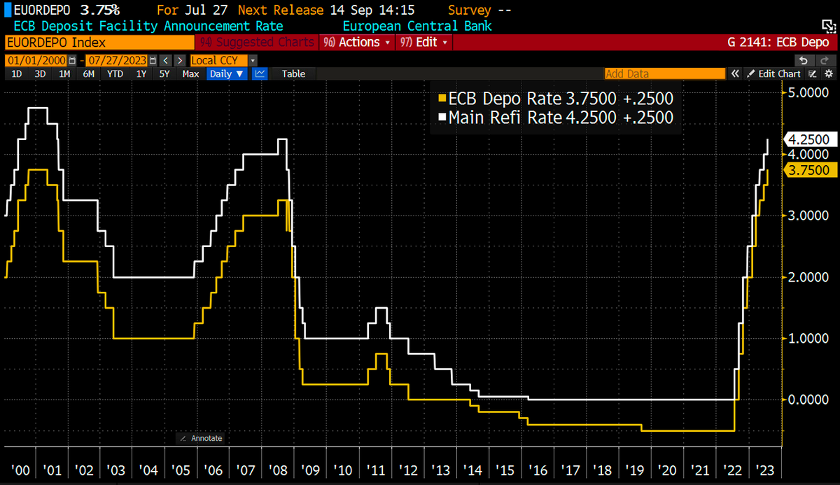 Девятое повышение подряд с июля прошлого года - процентная ставка по основным операциям рефинансирования достигла 4,25%. А ставка по депозитам достигла более чем 22-летнего максимума - 3,75%.