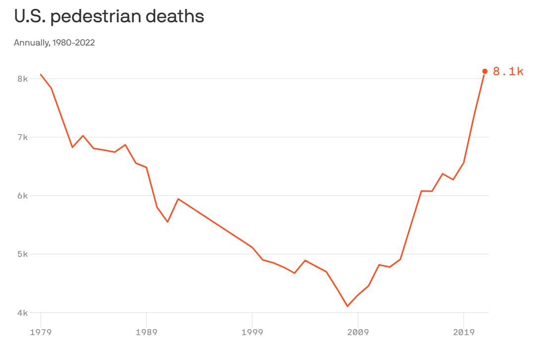 Нашли и причину - американцы покупают автомобили большего размера, которые с большей вероятностью могут привести к гибели велосипедистов или пешеходов в результате аварии. На эти транспортные средства приходится растущая доля смертей в дорожно-транспортных происшествиях.
