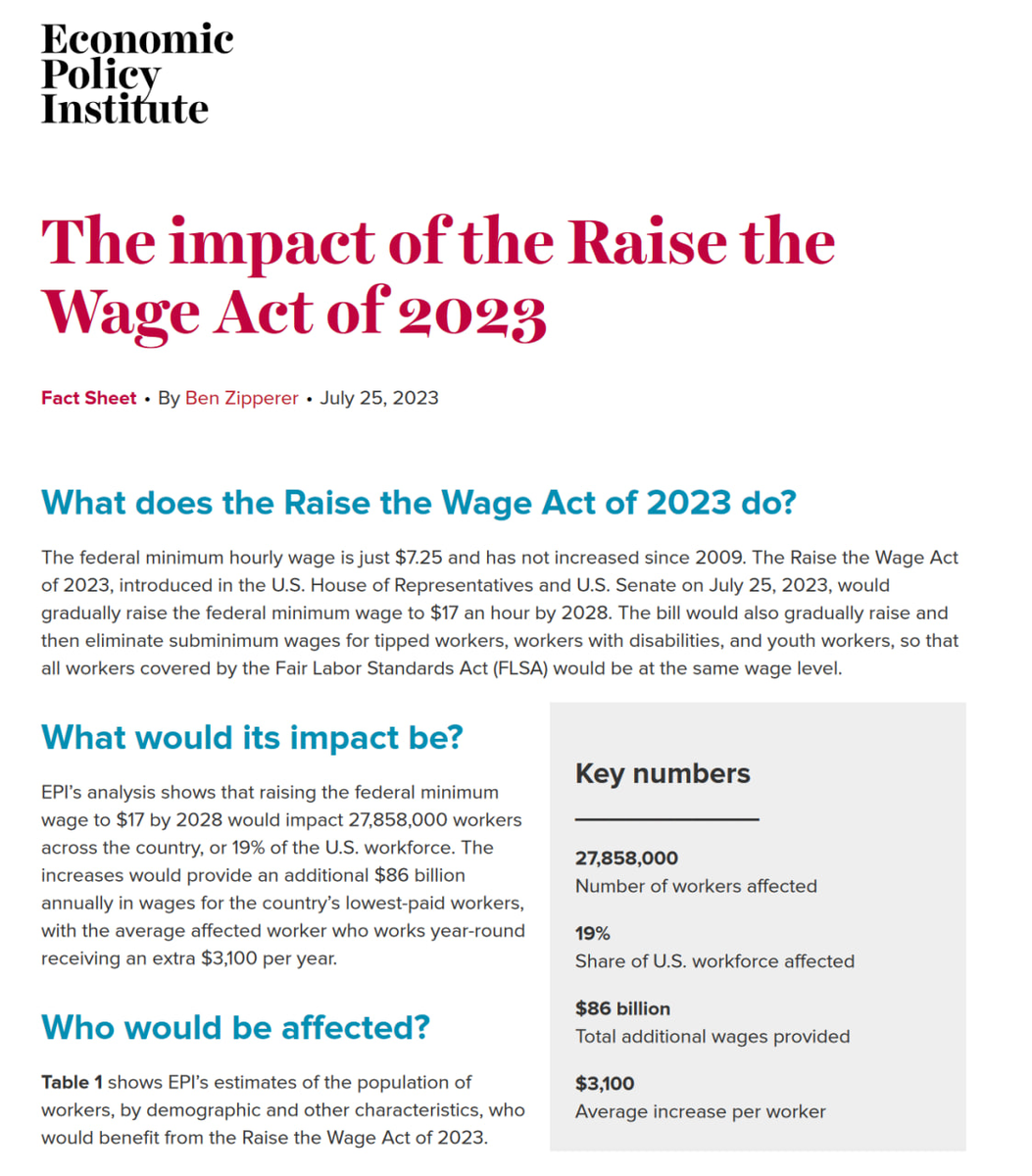 Анализ EPI показывает, что повышение федеральной минимальной заработной платы до 17$ к 2028 году затронет 27 858 000 работников по всей стране, или 19% рабочей силы США. Это увеличение обеспечило бы ежегодную прибавку к заработной плате самых низкооплачиваемых работников страны на 86 млрд $, при этом среднестатистический работник, работающий круглый год, получал бы дополнительно 3100$ в год.