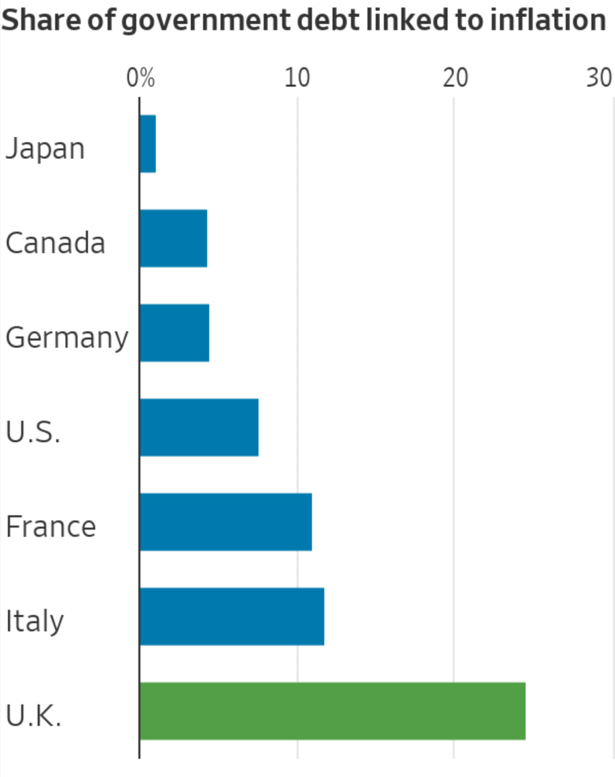 Примером проблемы, связанной с инфляцией, является Британия, которая столкнулась с самым быстрым ростом стоимости долга в группе семи развитых демократий. Великобритания впервые приняла такой долг при премьер-министре Маргарет Тэтчер и в 1981 году стала одной из первых развитых экономик, выпустивших долговые обязательства, привязанные к инфляции: ценные бумаги, которые там известны как linkers, и казначейские ценные бумаги, защищенные от инфляции, или TIPS, в США.