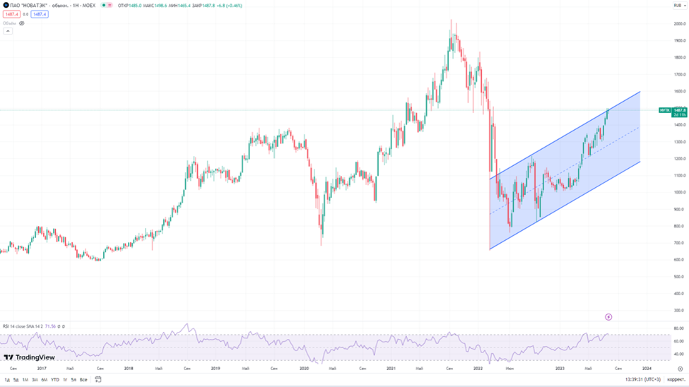 С начала года акции выросли более чем на треть. И уже превысили уровни, которые были до начала СВО. На данный момент акции закрепились выше значимого уровня 1400 рублей. И торгуются у верхней границы своего восходящего тренда.