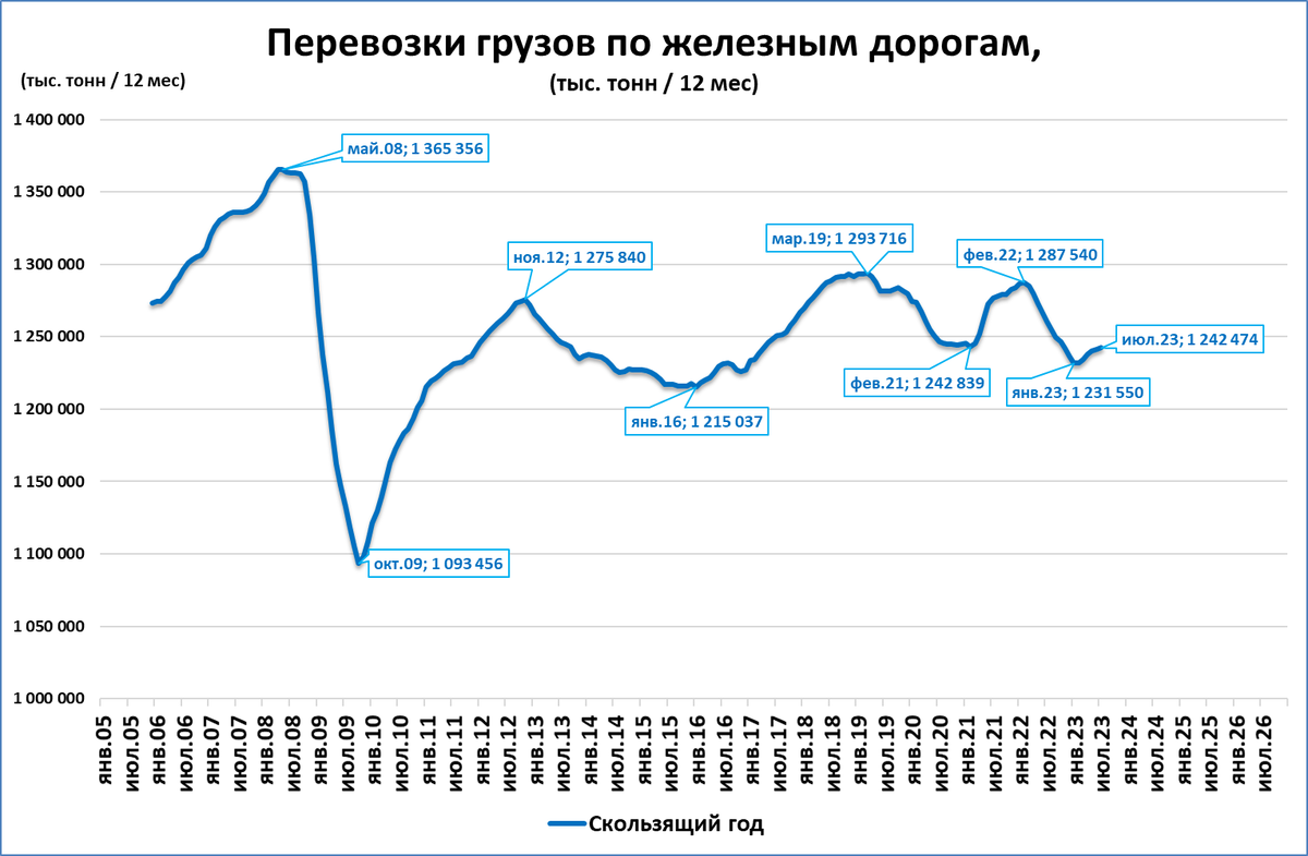 За последние 12 месяцев (скользящий год) перевезено 1,24 млрд тонн грузов.