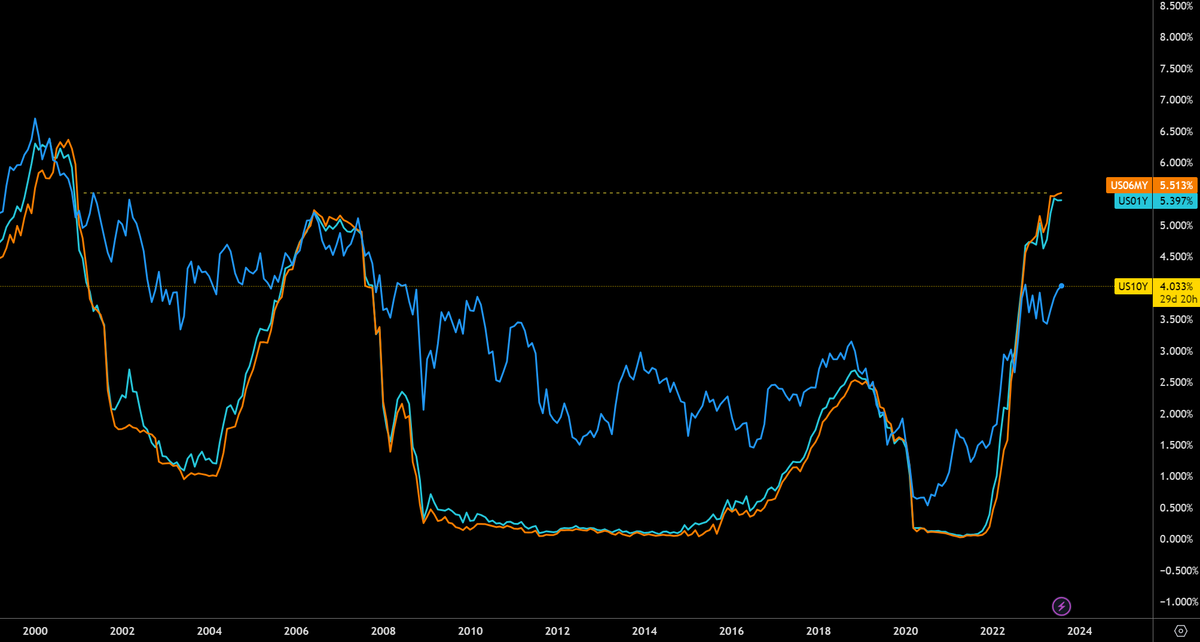 Ставки по казначейским облигациям США - моё почтение. Доходности 6-месячных и 1-летних бонды перешагнули значения 2006-2007 годов и находятся на уровнях 2001. Занять правительству США денюжку можно под 5,4% на год.