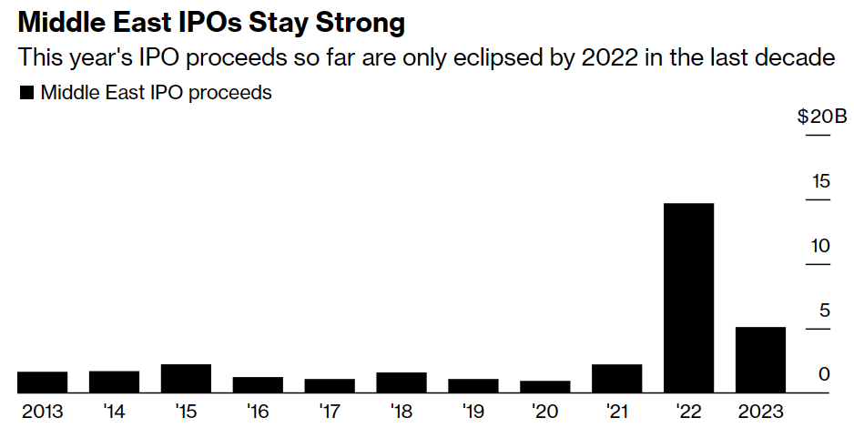 Согласно данным, собранным агентством Bloomberg, объем IPO на Ближнем Востоке в этом году составил 5,1 миллиарда долларов, что превышает объемы, наблюдавшиеся за аналогичный период за девять из последних 10 лет. Только 2022 год был более насыщенным: согласно данным, в прошлом году было привлечено 14,7 миллиарда долларов.