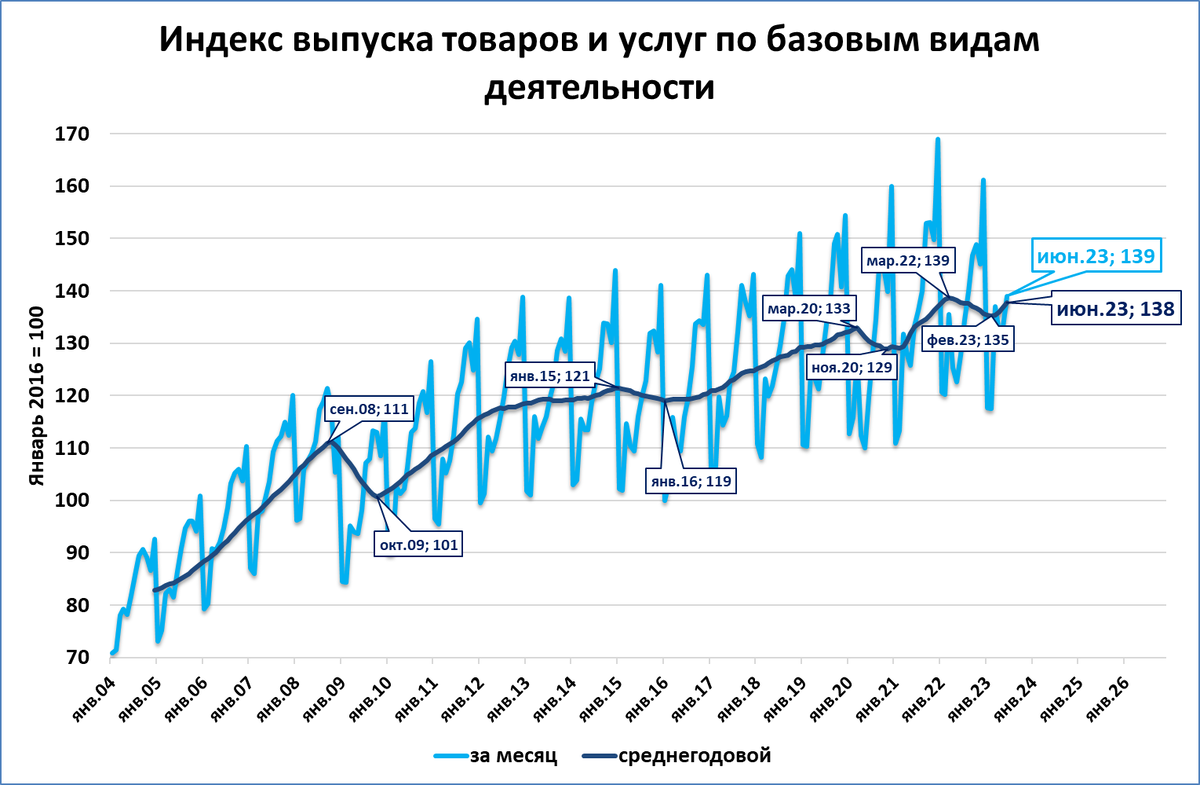 Среднегодовой индекс выпуска (138% от уровня января 2016; тёмно-синяя линия на графике ниже) почти вышел на докризисный максимум (139%), показанный в марте 2022 года.