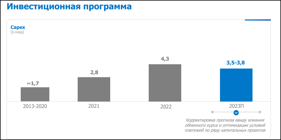 Эта инвестиционная программа требует высоких капитальных затрат вплоть до 2028 года. По первоначальным планам пики затрат $4-4,5 млрд приходились на период 2023-2025 г.