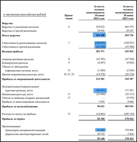 Выручка 554 млрд (-20% г/г). Основная причина снижения - падение цен на металлы. Немного сгладили картину увеличенные объемы продаж. К слову, компания переориентирует свой экспорт в Азию, на которую приходится уже половина сбыта металлов. Поставки в страны Евросоюза сократились более, чем в 2 раза.