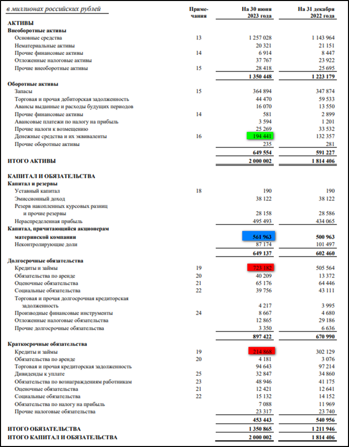 Денежных средств на счетах 194 млрд. А кредитов и займов суммарно 938 млрд. Таким образом, чистый долг 744 миллиарда. ND/ EBITDA = 1,5. Долговая нагрузка пока остаётся в пределах нормы, но видна отрицательная динамика. Долг за 1,5 года вырос в 2 раза.