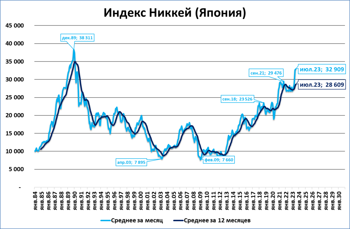 Японский фондовый индекс Никкей в июле показал очередной многолетний максимум. Он достиг 32 909 пунктов, что является лучшим результатом за последние 34 года (с 1990 года).