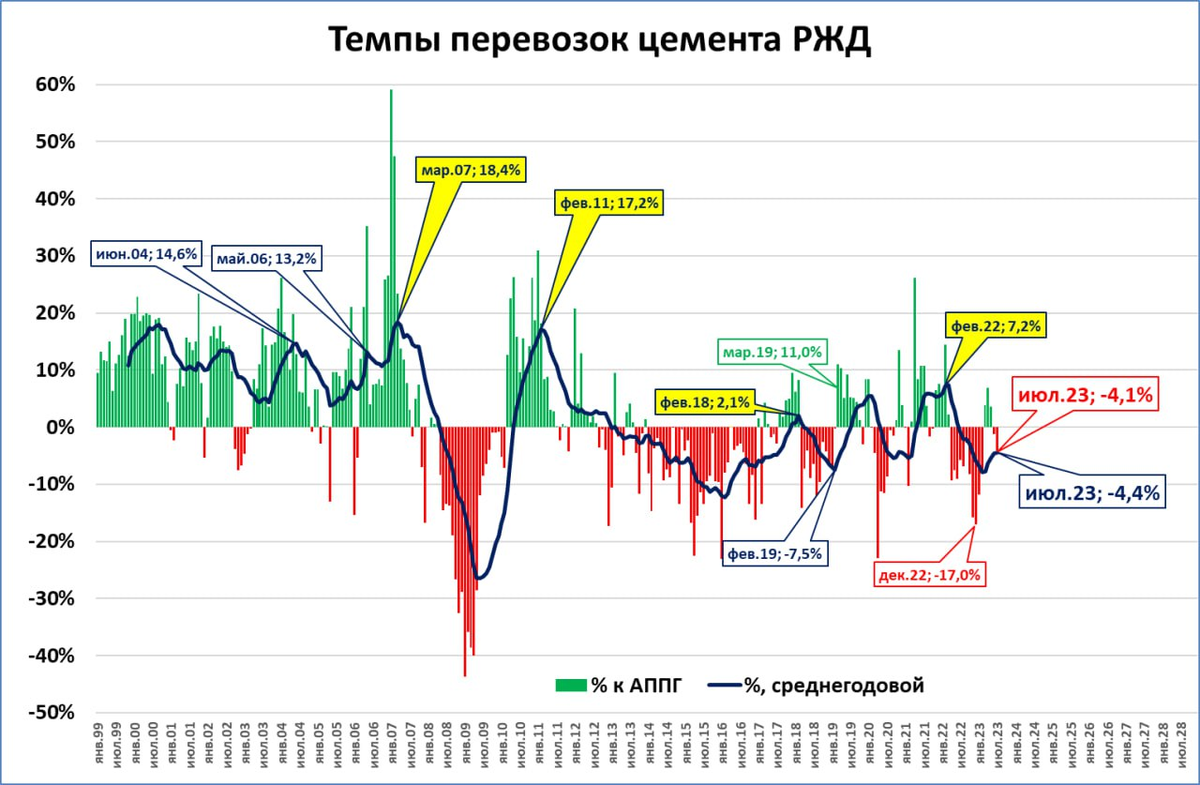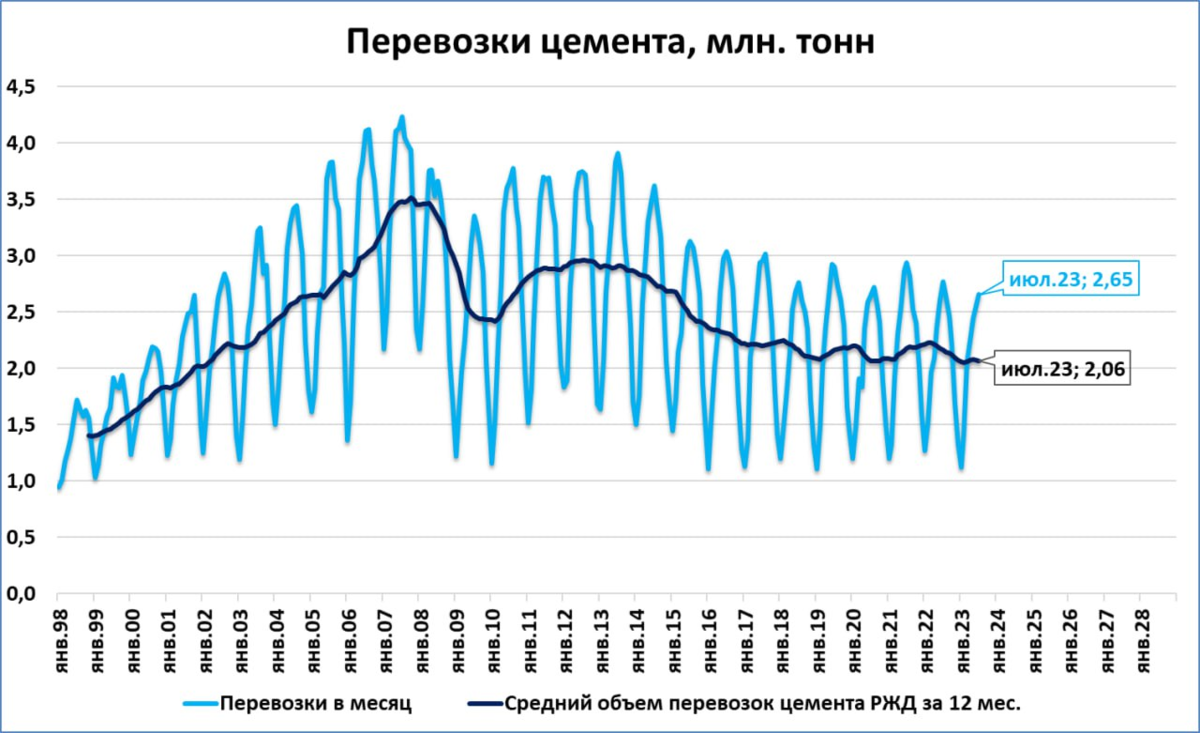 В июле, по этой оценке, железными дорогами было перевезено 2,65 млн. тонн цемента.