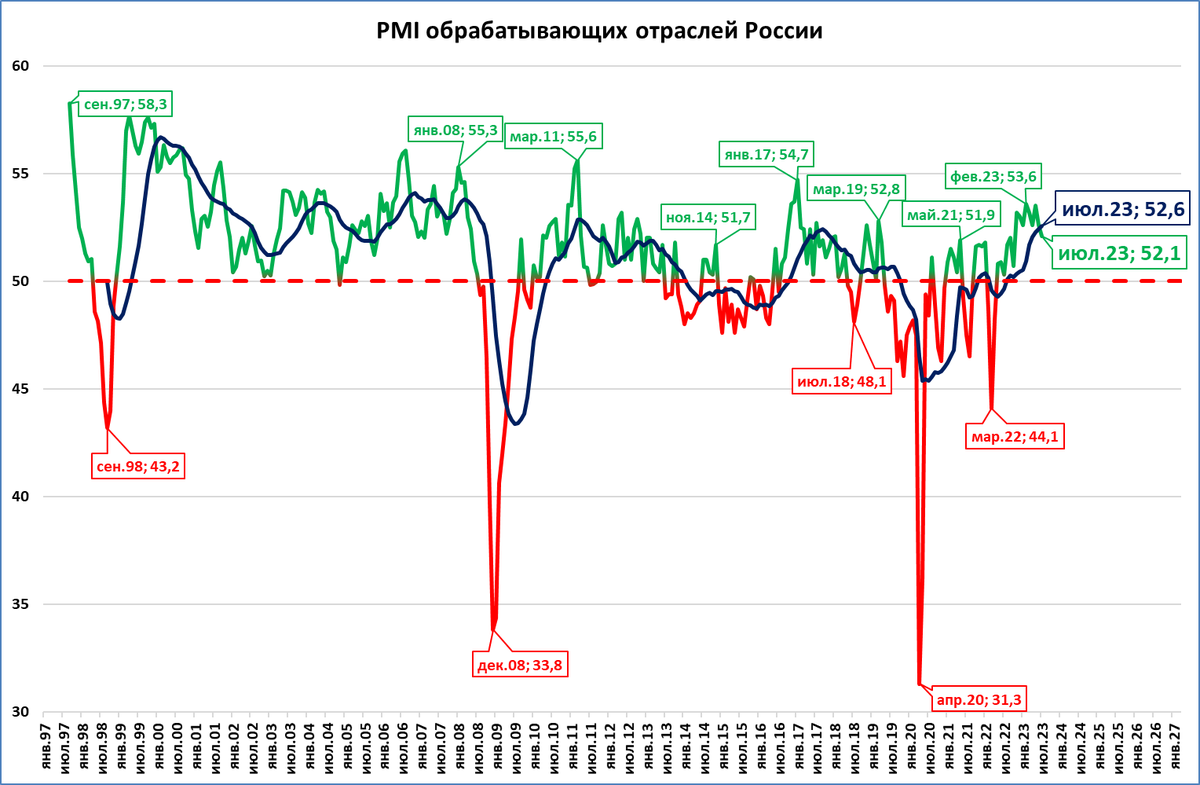 В июле рост активности (индекс 52,1) продолжился уже 15-й месяц подряд (с мая 2022 года).