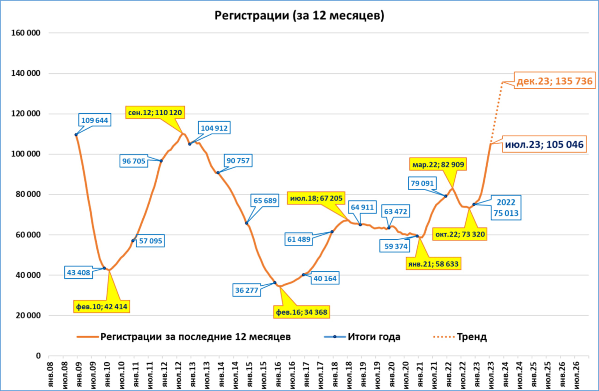 За последние 12 месяцев (скользящий год) регистрации составили 736 тыс.